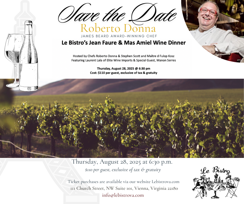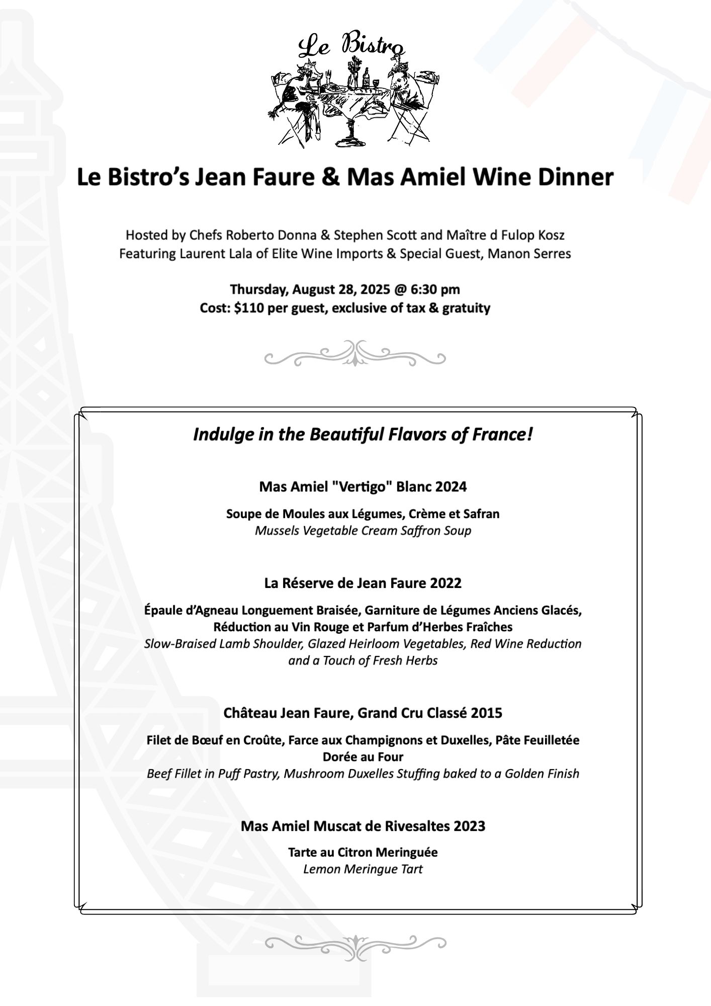 Le Bistro's Jean Faure & Mas Amiel Wine Dinner August 28 2025 | 111 Church Street NW Suite 101, Vienna, VA 22180 Sold Out